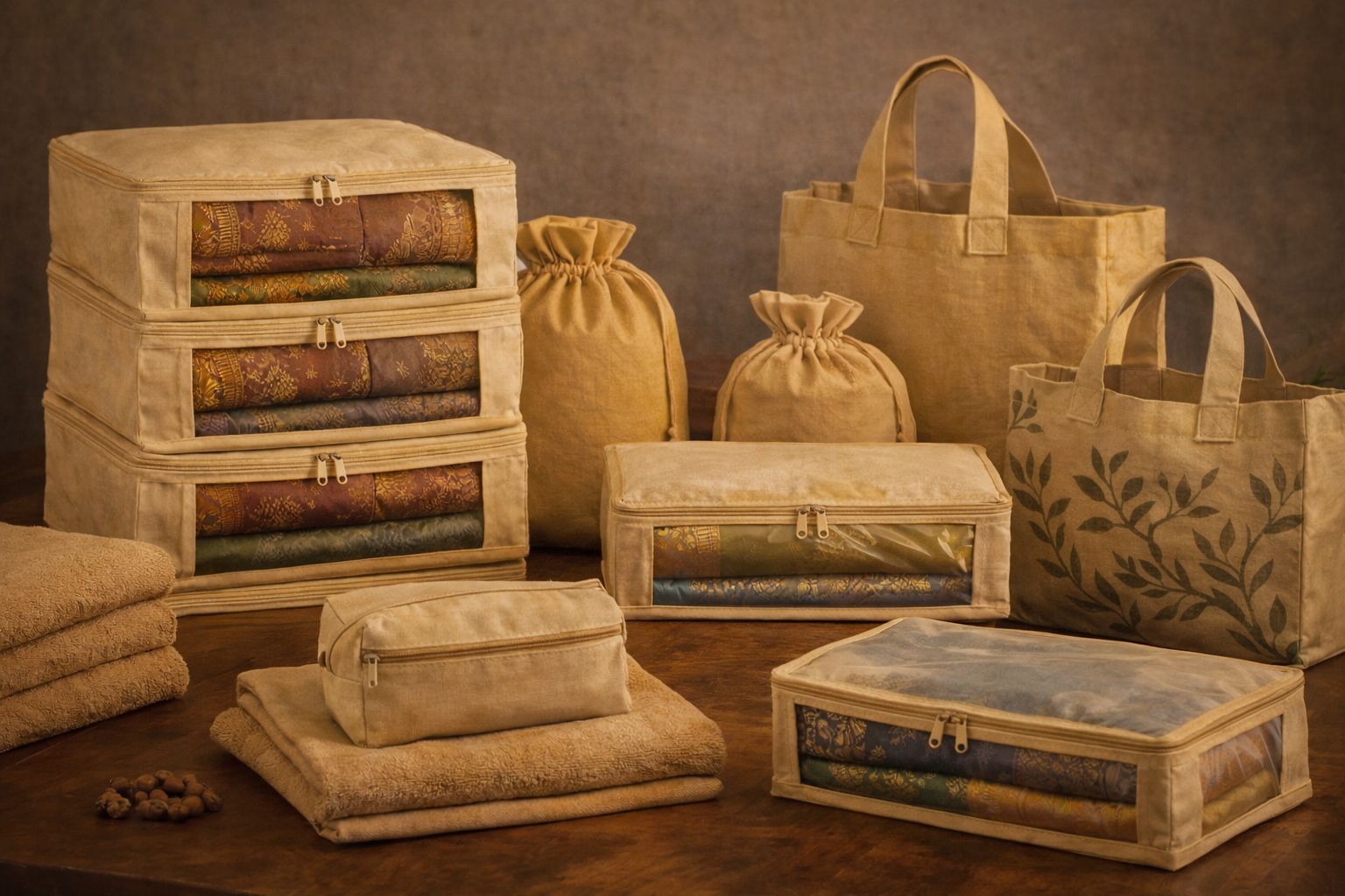 Premium cotton home storage collection with stackable boxes, totes, and pouches – perfect for organizing sarees, clothes, linens, and accessories. Durable, eco-friendly, and space-saving.